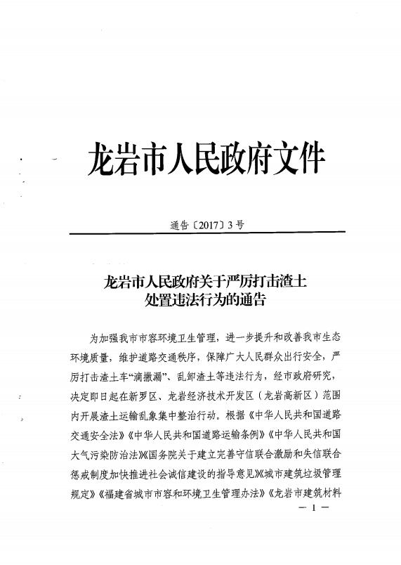 龍巖市人民政府關(guān)于嚴(yán)厲打擊渣土處置違法行為的通告(通告【2017】3號(hào))