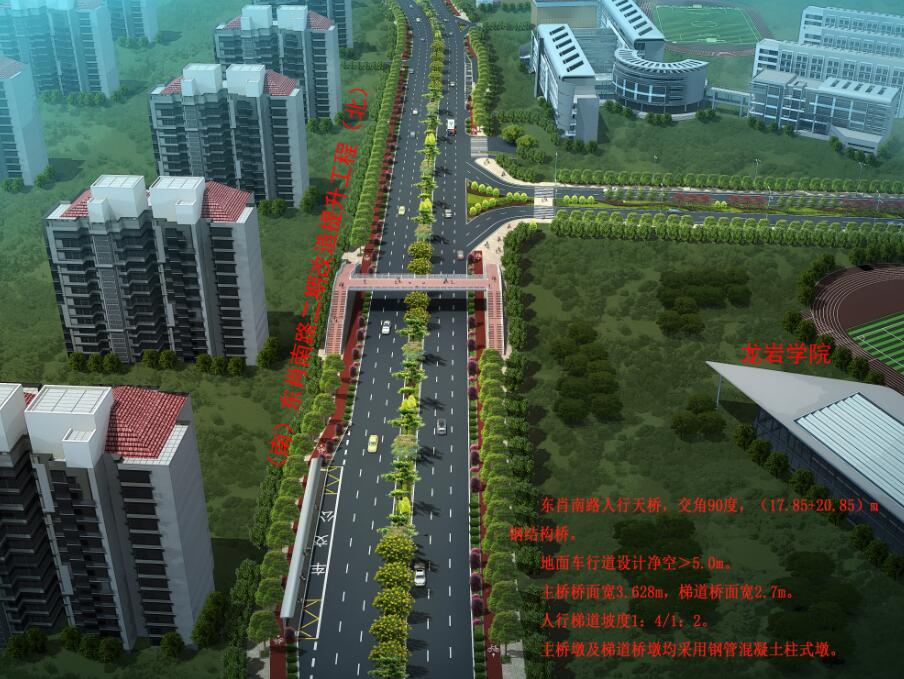 龍巖學(xué)院人行天橋位于龍巖學(xué)院大門北側(cè)約50米處,天橋采用“工”字形設(shè)計(jì),橋面長40米、寬3.6米,兩側(cè)梯道坡度為1:4和1:2,跨度分別為17.85米和20.85米,寬2.7米,主橋墩及梯道橋墩均采用鋼管混凝土柱式墩,總投資約450萬元。