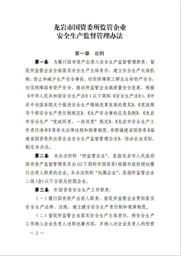 龍巖市國資委關(guān)于印發(fā)《龍巖市國資委所監(jiān)管企業(yè)安全生產(chǎn)監(jiān)督管理辦法》的通知(龍國資[2020]62號)